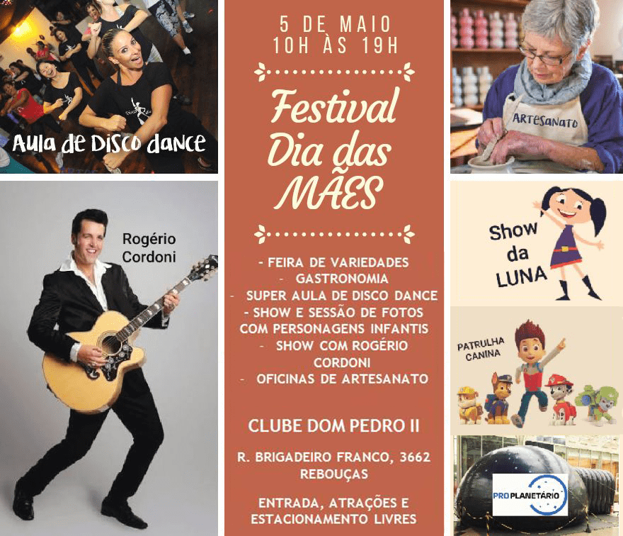 No próximo dia 5 de maio acontece, no Clube Dom Pedro, o Festival Dia das Mães, organizado pelo Grupo Queens Eventos. Com diversas atrações para toda a família, o festival é uma opção de passeio muito divertida para o sábado que antecede o fim de semana de Dia das Mães.