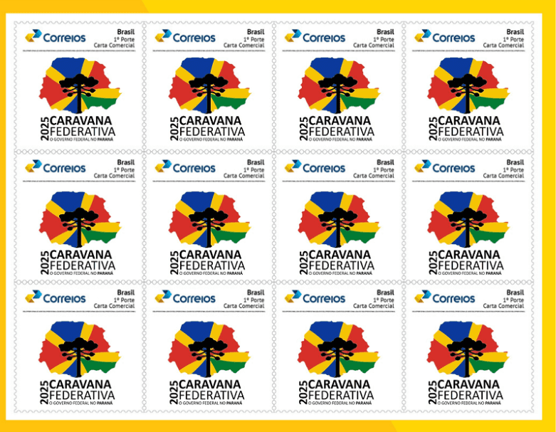 Os Correios lançaram o selo personalizado e o carimbo da Caravana Federativa no Paraná. A peça filatélica ilustra a brasilidade, tendo o mapa do Paraná e a araucária, árvore símbolo do estado, como elementos centrais. As cores representam a diversidade e a pluralidade. Os elementos em amarelo se unem mostrando a coletividade, união e diálogo – valores centrais da Caravana e do Governo Federal no Paraná. A escrita “Caravana Federativa 2025 – O Governo Federal no Paraná” registra este momento histórico.
