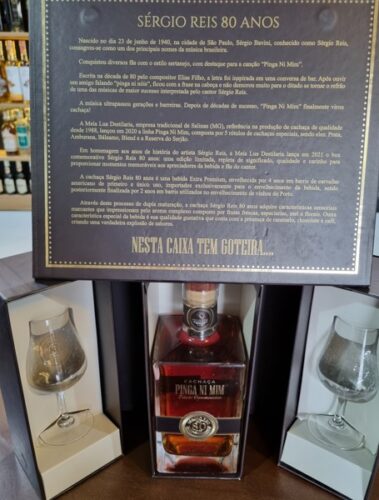 Para o Pai Sertanejo Raiz: A cachaça Pinga Ni Mim é uma homenagem pelos 80 anos do cantor Sérgio Reis, produzida na fazenda Meia Lua, Minas Gerais. Esse kit na versão luxo traz duas taças de cristal e uma fina embalagem contando um pouco da história do produto. Foi lançada série única, que não deverá ser renovada. É leve e agradável, apresentando aroma e sabor equilibrados com notas de especiarias. Preço do kit sob consulta. Somente a cachaça a partir de R$ 45 (de acordo com a embalagem e produção).