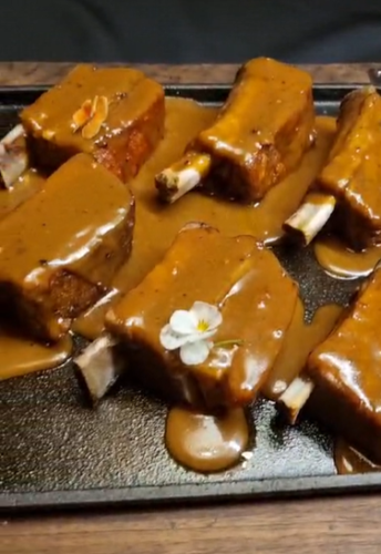 Dadinho de barriga de porco – Vem com marmelada de abacaxi picante e flor de coentro. Uma boa opção de entrada que certamente vai agradar, principalmente os fãs de agridoce: