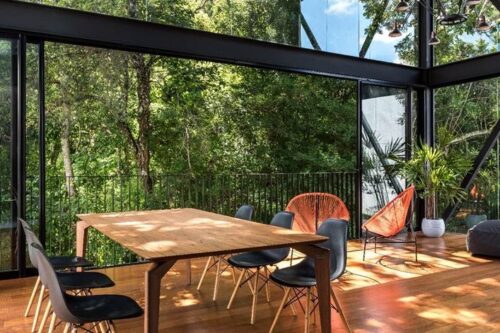 O projeto do arquiteto Luiz Volpato traz elementos minimalistas que, tanto no arquitetônico quanto no interior, destacam a organicidade da natureza que circunda a residência. Os poucos apoios estruturais permitem a conexão da rua com o exuberante bosque dos fundos do lote; conferindo leveza e a permeabilidade visual para a área mais interessante do lote.