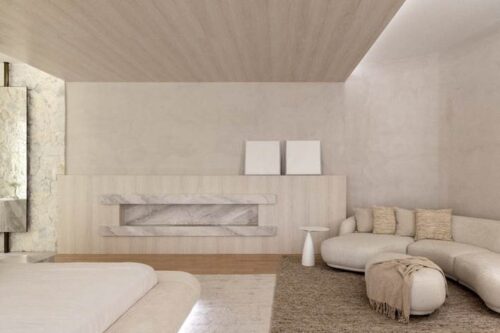 As texturas são base para o conceito da organicidade. Neste projeto, assinado pelo escritório SUIÍTE Arquitetos, o Travertino NPK surge como pano de fundo para o imponente painel criado na sala de estar, que se estende até a lareira. A peça ainda ganha detalhes criados com tijolos, que agregam um charme único e abraçam a rusticidade dos materiais.