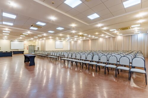 Um dos pontos fortes do hotel é a sala de eventos, que comporta 350 pessoas com a possibilidade de ocorrer dois eventos ao mesmo tempo, por ter uma divisória que permite essa proposta. Seu estacionamento é enorme e traz maior comodidade para o hóspede e um diferencial para os eventos.