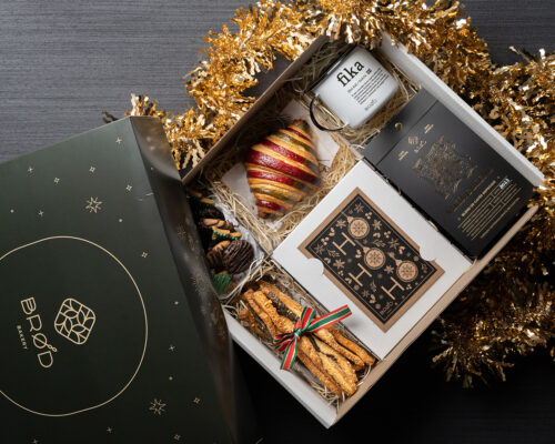 Entre as Cestas de Natal, a Finland (R$ 340) contempla cartão de presente festivo de Natal em Kraft ecológico, café especial Brød Coffee 250g, caneca da coleção Brød dos países nórdicos, grissinis de massa folhada, croissant natalino com recheio de chocolate branco, biscoitinhos decorados de Natal e mini cookies.