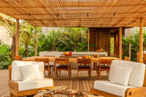 Ao todo, são sete acomodações: três suítes no corpo principal da casa (entre 35m² e 45m², com banheiras e varandas) e quatro bangalôs de 90m², com piscina privativa, deck, espaços de trabalho e banheiros amplos. A proposta de hospitalidade é o acolhimento total em que o hóspede é convidado a se sentir em casa. “A ideia é que ele se sinta à vontade para até abrir nossa geladeira”, comenta Eduardo.