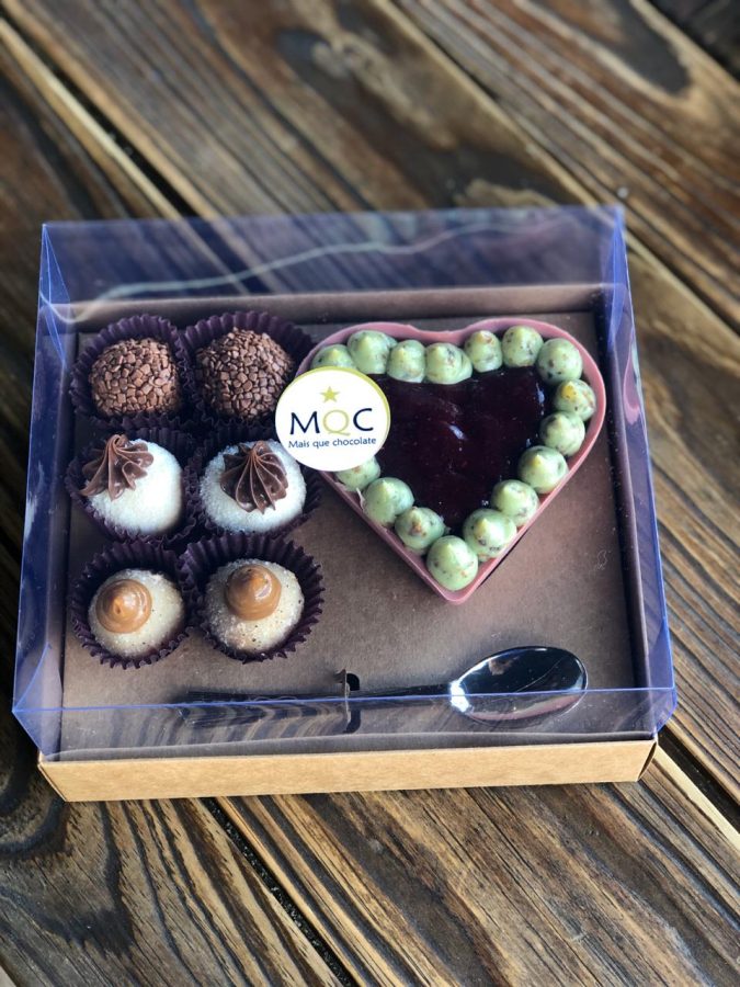 São três opções de caixas de coração de chocolate produzidos com o tradicional chocolate belga Callebaut.