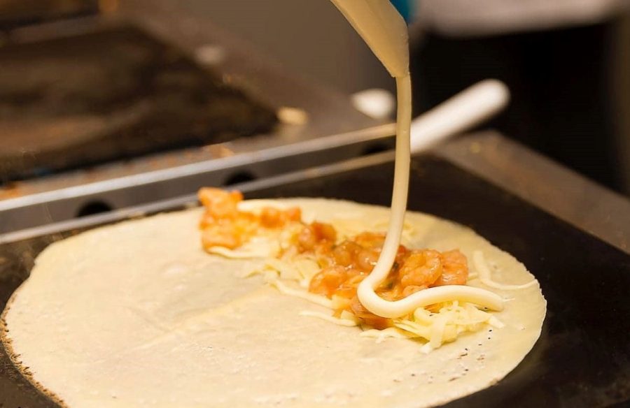O crepe francês é feito em chapas especiais, com a técnica adequada para garantir uma massa fininha e leve. Entre os recheios, camarões, carne desfiada, frango, vegetais, queijos e sabores doces são algumas das sugestões.