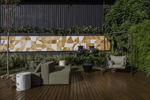 Um dos destaques da edição de 2022, o parquinho de madeira, mantém sua importância na Mostra deste ano. O local fica ao lado do espaço The Landscape, idealizado pela arquiteta July Franchesca Dallagrana, que traz um grande lounge ao ar livre com mesas, cadeiras e sofás, e um jardim de cores e texturas voltado à contemplação e ao bem-estar. Ao fundo, se sobrepõe o mural de azulejaria do artista Rômulo Lass, inspirado nas curvas de Oscar Niemeyer.