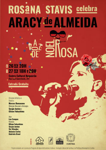 Nos dias 26 e 27 de fevereiro, o Centro Cultural Boqueirão (R. José Guercheski, 281), recebe o espetáculo musical “Aracy – A Voz de Noel”, em três sessões gratuitas, (sábado às 20h00 e domingo às 18h00 e 20h00), em que o público poderá conhecer um pouco mais da vida e obra de dois dos maiores nomes da música brasileira, Aracy de Almeida e Noel Rosa.