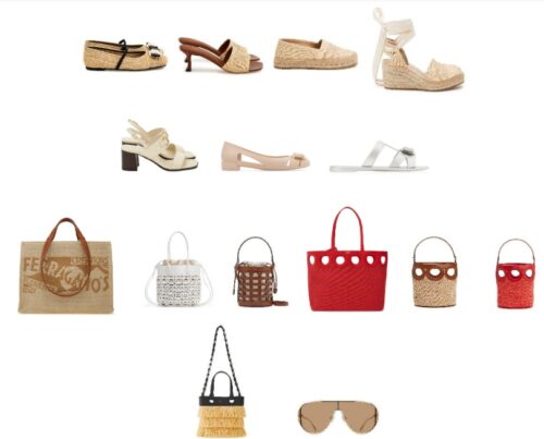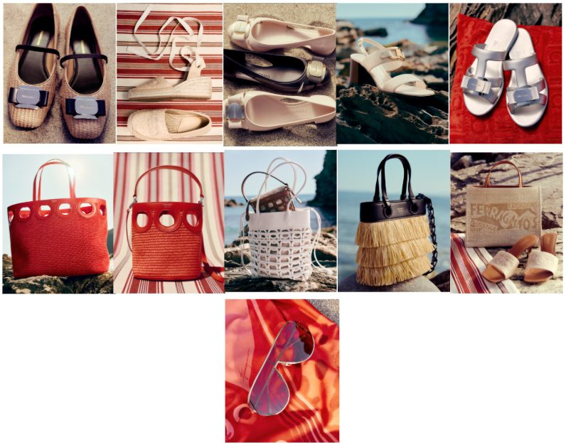 A icônica sapatilha ballerina com placa Vara em ráfia trançada, com laço e tira contrastantes em preto; mules de lona adornados com o famoso logotipo desenhado por Lucio Venna nos anos 1920; alpargatas de lona macia, também disponíveis na versão com salto anabela e amarração no tornozelo; sandálias clássicas de couro com salto bloco; e sapatilhas e slides de borracha perfeitos para a praia.