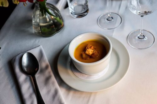 OU Velouté cremoso de abóbora cabotiá com croutons.