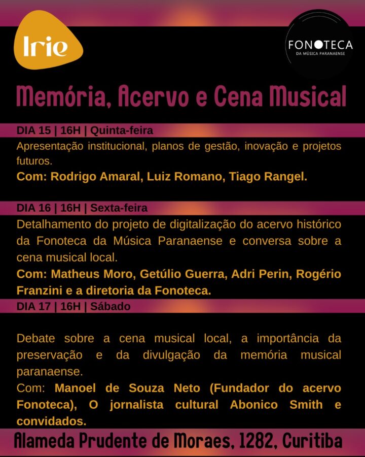 A Fonoteca da Música Paranaense realiza, entre os dias 15 e 17 de janeiro (quinta-feira a sábado), a série de debates “Memória, Acervo e Cena Musical”. O evento, que ocorre no Irie Bar, sempre às 16h, é aberto ao público, com entrada gratuita. A iniciativa visa discutir a preservação do patrimônio sonoro em três eixos: a gestão institucional de acervos, os processos técnicos de digitalização e o papel fundamental da cena local e da crítica cultural.