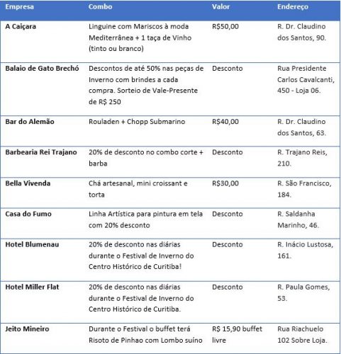 É importante salientar que os descontos também são oferecidos em outros estabelecimentos do Centro Histórico. São preços especiais em hospedagens, cortes de cabelo, artefatos de pintura e roupas. As opções completas e os preços podem ser conferidos na tabela abaixo.