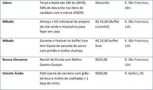 Durante todos os dez dias do Festival, estabelecimentos que ficam no entorno do Centro Histórico trazem pratos deliciosos com descontos especiais. “Desta vez não temos preços ou pratos pré-determinados. A criatividade de cada estabelecimento, assim como a demanda de seus clientes, foi o fator principal”, explica Maria Bonamigo, presidente da Rede Empresarial do Centro Histórico.
