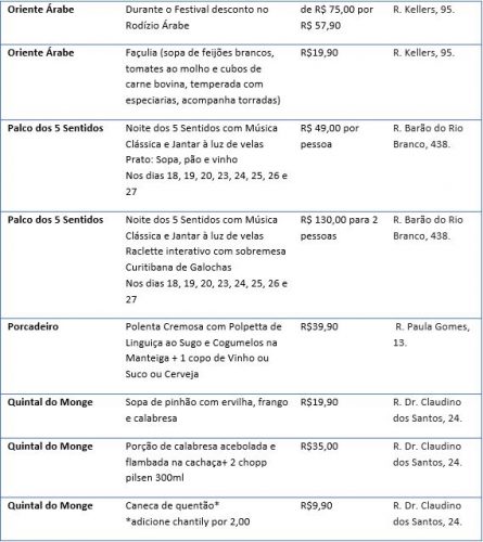 Pela primeira vez o Festival de Inverno traz uma feira gastronômica em pleno calçadão do Largo da Ordem. Em parceria com a Abrasel, Prefeitura de Curitiba, Fundação Cultural de Curitiba e Instituto Municipal de Turismo será realizada a 1ª edição da Curitiba Sabores. Nos dias 19 e 20 de julho vinte restaurantes terão suas barraquinhas espalhadas ao longo da Rua Dr. Claudino dos Santos, entre a Rua do Rosário e o bebedouro, com pratos a preços fixos de R$ 15.