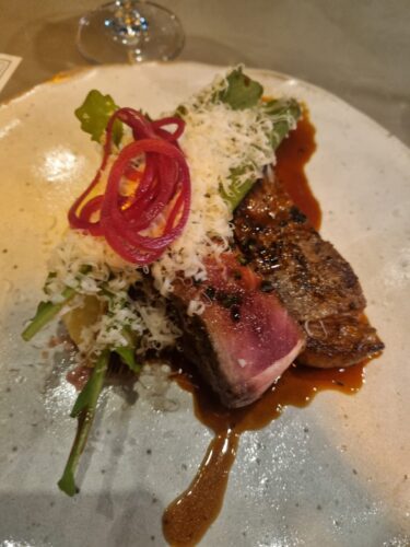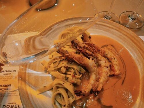 O menu seguiu com camarões na churrasqueira, fettucine na manteiga de cítricos, salsinha, alho e pimenta dedo de moça com molho de camarão e azeite de manjericão, harmonizados com Maestro Dobel Diamante, uma tequila 100% agave da categoria cristalino feita com uma mistura de várias idades de tequilas reposado, añejo e extra-añejo envelhecidas em barris do Leste Europeu. A bebida passa por um processo de filtragem artesanal conhecido como “diamante”, usando carvão ativado, em que toda a cor e sabores amargos são removidos, mas preservando a complexidade e suavidade.