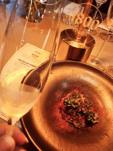 Para começar, uma degustação de peixe cru curado, redução de tangerina com alga kombu, vinagrete de semente de girassol, salsa de camarão, brócolis tostado e sal de hibisco, combinado com a tequila 1800 Silver, que apresenta leveza e suavidade.