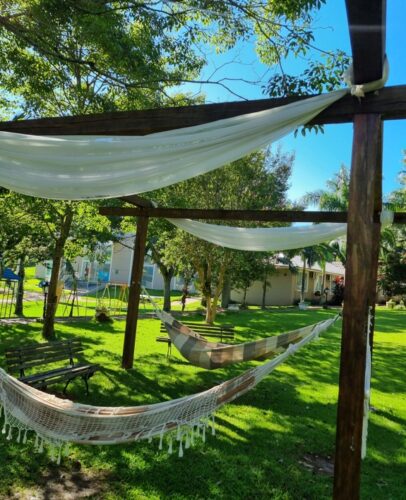Redes para descanso, parquinho infantil, casa de bonecas, quadra de esportes e salão de jogos complementam as atrações.