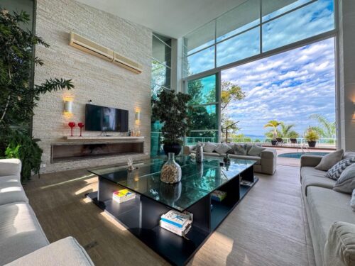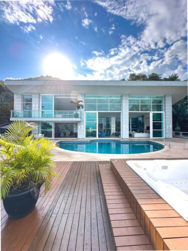 Com seis suítes, oito banheiros e quatro vagas de garagem, a mansão foi projetada para valorizar ao máximo o entorno natural. As rochas nativas foram preservadas e incorporadas ao design, criando uma conexão autêntica com a mata atlântica. A área social, localizada no terraço, integra cozinha em tons neutros, espaços amplos de convivência e um deck com piscina e hidromassagem de frente para o mar. À noite, a piscina ganha protagonismo com iluminação programável, que cria efeitos cênicos em diferentes tons.