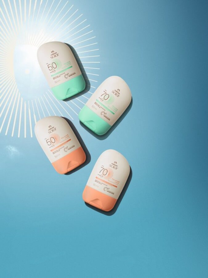 A linha Natura Solar conta com protetores corporais e faciais em diferentes níveis de proteção, de FPS UVB 30 a FPS UVB 70 e sempre com 1/3 de FPUVA, para proteger as diferentes camadas da pele, com fórmulas pensadas para peles normais a secas, mistas a oleosas desde o uso diário a alta exposição solar. Os protetores faciais, em especial, ganham protagonismo na rotina de cuidado diário: resistência à água e ao suor, não comedogênicos, com opções em FPS 50 e 70 e benefícios específicos por tipo de pele, são ideais para quem busca proteção sem abrir mão do conforto. Enquanto as versões para peles mistas a oleosas oferecem textura fluida ultraleve, efeito matte instantâneo e com partículas que absorvem a oleosidade de forma imediata e garantem um controle de oleosidade por até 12 horas, as fórmulas para peles normais a secas entregam textura leve, toque aveludado e complexo nutritivo que oferece uma hidratação revitalizante por até 8h.