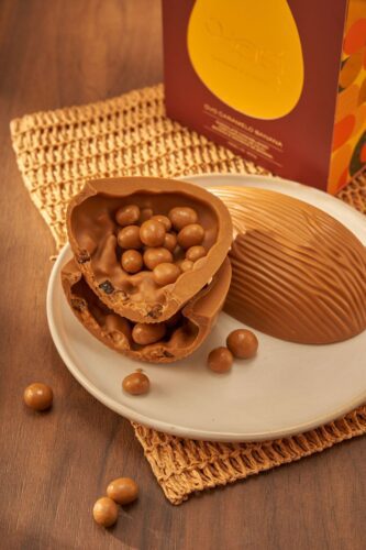 Um que já fez sucesso em outras edições é o Ovo Torrone (foto destaque, R$269 — 600g) e ele retorna às prateleiras em duas versões: Intenso, com pedaços de torrone extra-macio recheando a casca feita de chocolate 70%, também de Tuerê. Dentro, alguns bombons de torrone soltos completam a experiência; e ao Leite com chocolate 42% cacau paraense, desta vez de Mocajuba. Esse ovo, além de gostoso é muito bonito, e tem uma estética que agrada primeiro os olhos, depois o paladar. Merece grande destaque também o premiado Ovo Caramelo & Banana (R$199,90 — 300g). Ele usa o chocolate caramelo ganhador da medalha de bronze da Chocolate Awards 2024, que mistura notas de doce de leite com pedaços de banana-passa e castanha de caju. As drágeas de Banoffee que recheiam seu interior também são premiadas: receberam medalha de bronze na Academy Of Chocolate de Londres em 2023. Essa mistura do doce de leite, banana-passa e caramelo traz um sabor único, diferente, doce sem ser enjoativo. Com certeza será outro grande sucesso da marca nesse ano. Vale ainda mencionar o Ovo Favinho (R$179,90 — 300g) com casca de chocolate intenso 57% cacau com pedaços de caramelo aerado feitos com mel silvestre de Campo Largo. É a parte aereda que traz uma textura diferente, lembrando uma colmeia – perfeito para quem ama mel!