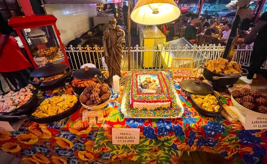 Comidas típicas, mesa de doces gratuita, bolo de Santo Antônio, quentão, pinhão e muito mais