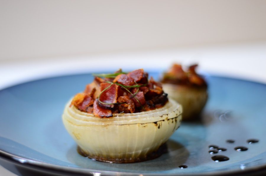 Recheie as cumbucas de cebola, disponha em uma travessa refratária e asse a 170 ºC por 35 minutos. Pique finamente as fatias de bacon e frite até ficarem crocantes. Coloque o bacon por cima das cebolas e sirva quente.