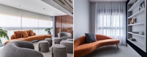 Em varanda e home office, os sofás curvos participam dos ambientes como locais de inspiração que estimulam o momento de sentar e apreciar a beleza do momento.