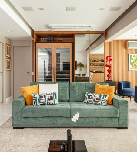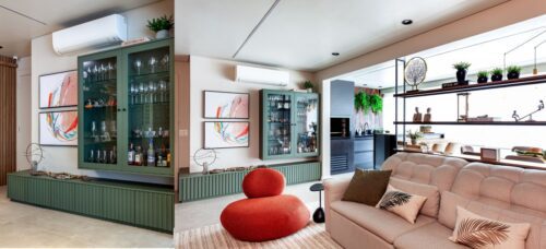 Marcenaria criativa – Com a pegada camaleoa da marcenaria, o verde acompanha inúmeras composições dos profissionais da arquitetura. A cristaleira verde, pensada pela arquiteta Cristiane Schiavoni, é para ser a personagem principal nesse apartamento. Integrada ao mobiliário com o ‘L’ que forma com a parte inferior, ela oferece compartimentos estratégicos, guardando desde o essencial do dia a dia até os calçados logo ao chegar em casa. Para selar essa união, as artes escolhidas refletem quem vive ali e as prateleiras de vidro, feitas sob medida, organizam cristais e garrafas como se fossem obras-primas.
