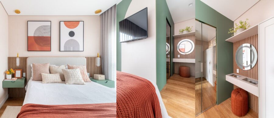 No dormitório desse casal, a arquiteta Mari Milani se inspirou no aconchego na natureza para definir a paleta de cores. Junto com o amadeirado, ela destacou o terroso para acompanhar o verde-oliva da marcenaria. O equilíbrio sutil marca presença nas mesinhas laterais suspensas, no detalhe da parede com a TV e na entrada do closet, que também leva ao banheiro.