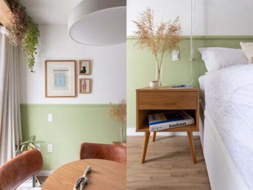 Pintura – Neste studio com 40 m², o arquiteto Raphael Wittmann adicionou uma pitada de cor ao nomear o verde-oliva para a composição da meia-parede. Com arquitetura de interiores que faz a linha natural chic, percebida tanto pela força da madeira na sua forma original e no porcelanato do piso, além das plantas, o projeto é uníssono com o propósito de agradar e propiciar tranquilidade ao morador.