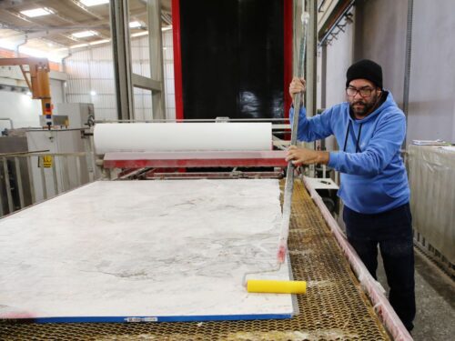 Após essa etapa, os materiais são armazenados em grandes caminhões adaptados para cargas pesadas e transportados com destino à indústria, no caso, a fábrica da Gramarcal – é lá que esses blocos são transformados em chapas.