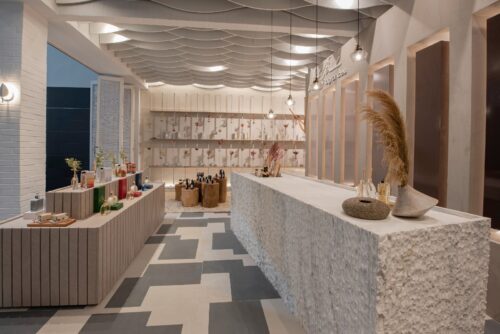 A loja Mels Brushes, de Renata Pisani, também coloca em evidência o papel de parede da Villa Batel. Enquanto nos Toilettes, assinado por Karine Senra, a mesa genebra favorece o espaço conferindo um traço encantador para o projeto.