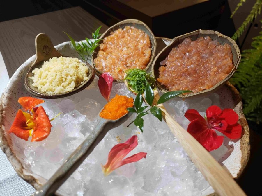 Uma boa pedida para abrir o paladar é o Tartar da casa, preparado com atum e salmão batido temperados e acompanhados de ovas de capelim, farofa de tempurá e cheiro verde (R$ 49). A apresentação é uma atração a parte: vem numa gamela repleta de gelo.